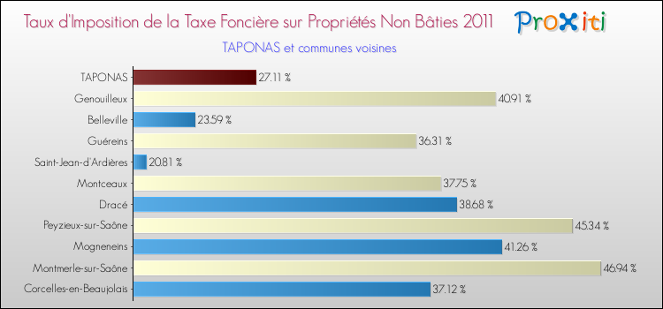 En 2011, le taux de la taxe foncière sur le non bâti vôté par le conseil municipal de Taponas était de : 27.11 %.