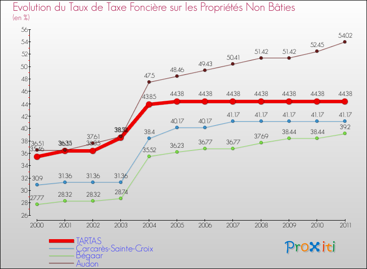 A Tartas, le taux de taxe foncière sur le non bâti a donc augmenté de 25.16 % entre 2000 et 2011.