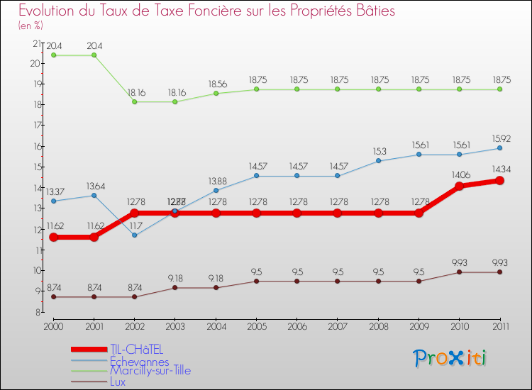 En 2011, le taux de la taxe foncière sur le bâti vôté par le conseil municipal de Til-Châtel était de : 14.34 %.