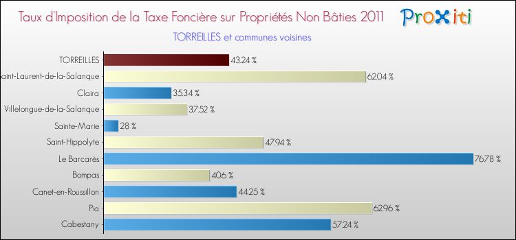 En 2011, le taux de la taxe foncière sur le non bâti vôté par le conseil municipal de Torreilles était de : 43.24 %.