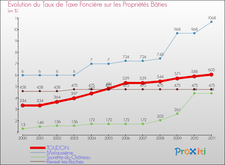 A Toudon, le taux de taxe foncière sur le bâti a donc augmenté de 81.14 % entre 2000 et 2011.