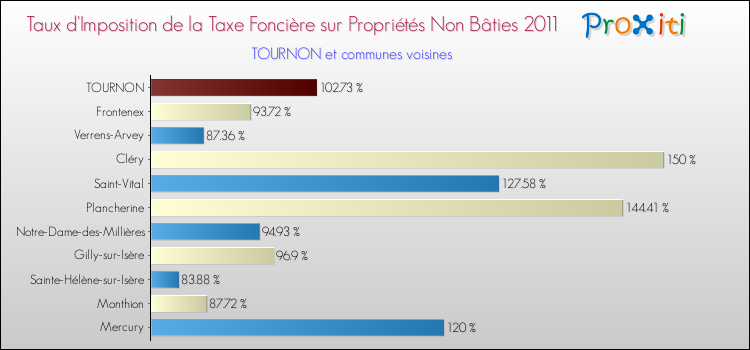 En 2011, le taux de la taxe foncière sur le non bâti vôté par le conseil municipal de Tournon était de : 102.73 %.