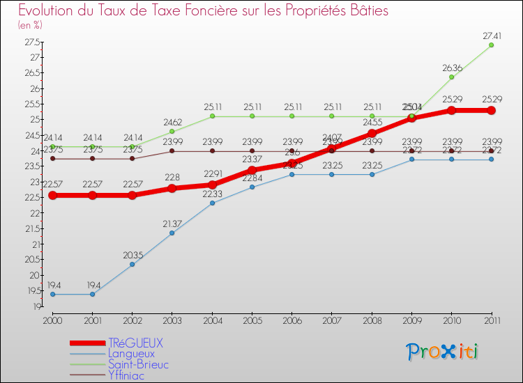 En 2011, le taux de la taxe foncière sur le bâti vôté par le conseil municipal de Trégueux était de : 25.29 %.