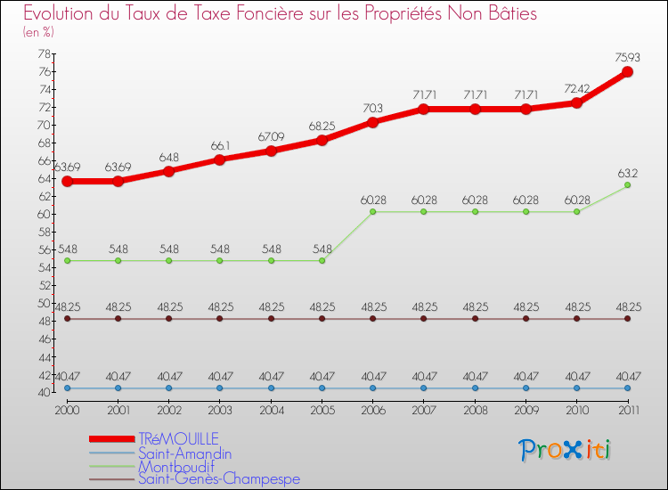 Pendant la même période, les communes françaises similaires à Trémouille, ont vu leur taux de taxe foncière sur le non bâti baisser de 0.78 % en moyenne entre 2000 et 2011.