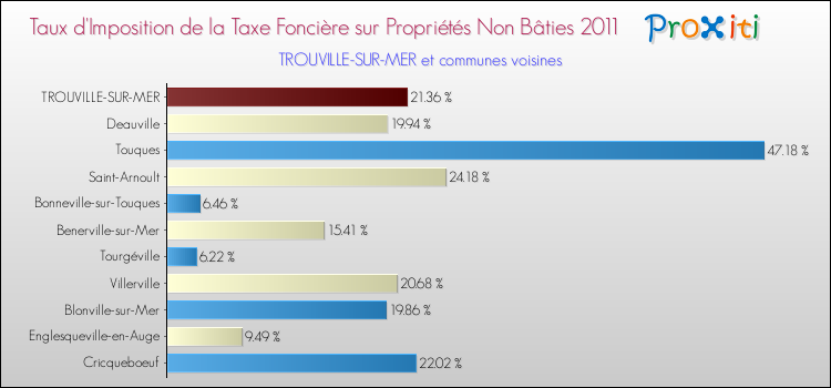 Pendant la même période, les communes françaises similaires à Trouville-sur-Mer, ont vu leur taux de taxe foncière sur le non bâti augmenter de 11.14 % en moyenne entre 2000 et 2011.