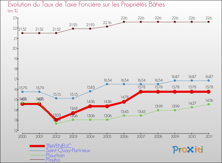 A Tréveneuc, le taux de taxe foncière sur le bâti a donc augmenté de 8.23 % entre 2000 et 2011.