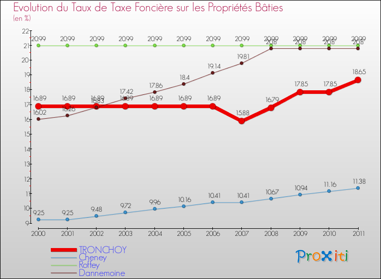 A Tronchoy, le taux de taxe foncière sur le bâti a donc augmenté de 10.42 % entre 2000 et 2011.