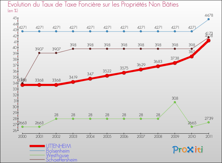 En 2011, le taux de la taxe foncière sur le non bâti vôté par le conseil municipal de Uttenheim était de : 41.18 %.