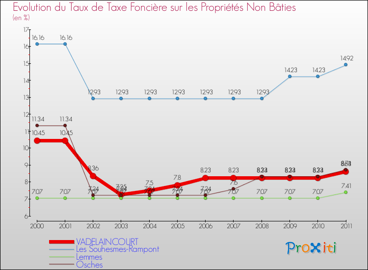 A Vadelaincourt, le taux de taxe foncière sur le non bâti a donc baissé de 17.42 % entre 2000 et 2011.