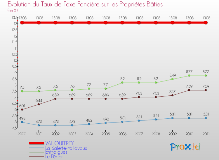 A Valjouffrey, le taux de taxe foncière sur le bâti a donc augmenté de 0 % entre 2000 et 2011.
