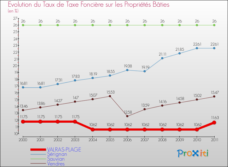 Pendant la même période, les communes françaises similaires à Valras-Plage, ont vu leur taux de taxe foncière sur le bâti augmenter de 22.28 % en moyenne entre 2000 et 2011.