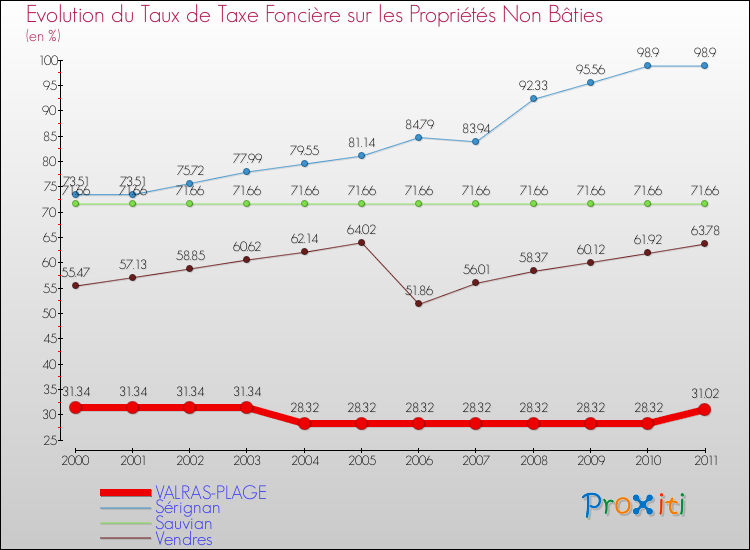 Pendant la même période, les communes françaises similaires à Valras-Plage, ont vu leur taux de taxe foncière sur le non bâti augmenter de 3.71 % en moyenne entre 2000 et 2011.