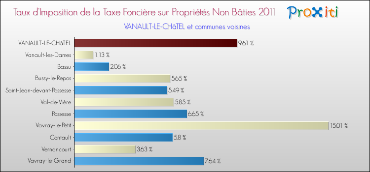 En 2011, le taux de la taxe foncière sur le non bâti vôté par le conseil municipal de Vanault-le-Châtel était de : 9.61 %.