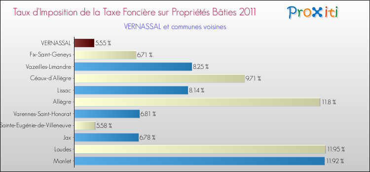 A noter : la valeur moyenne de ce taux de taxe foncière sur le bâti dans les communes françaises similaires à Vernassal était de 11.86 %, en 2011.