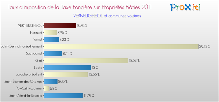 En 2011, le taux de la taxe foncière sur le bâti vôté par le conseil municipal de Verneugheol était de : 10.76 %.
