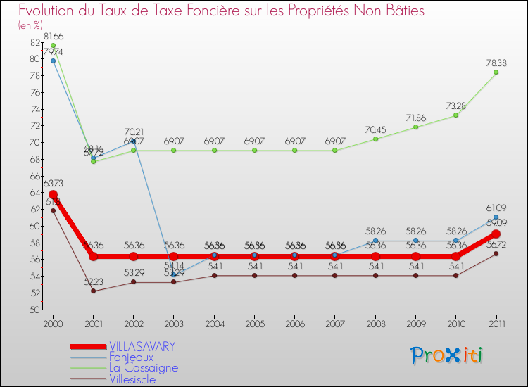 A Villasavary, le taux de taxe foncière sur le non bâti a donc baissé de 7.28 % entre 2000 et 2011.
