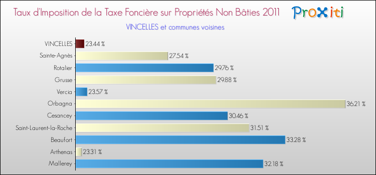 En 2011, le taux de la taxe foncière sur le non bâti vôté par le conseil municipal de Vincelles était de : 23.44 %.