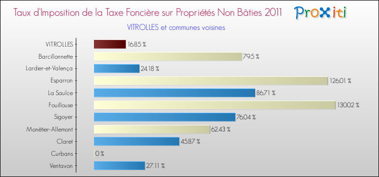 En 2011, le taux de la taxe foncière sur le non bâti vôté par le conseil municipal de Vitrolles était de : 16.85 %.