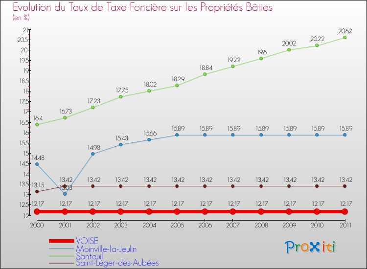 A Voise, le taux de taxe foncière sur le bâti a donc augmenté de 0 % entre 2000 et 2011.