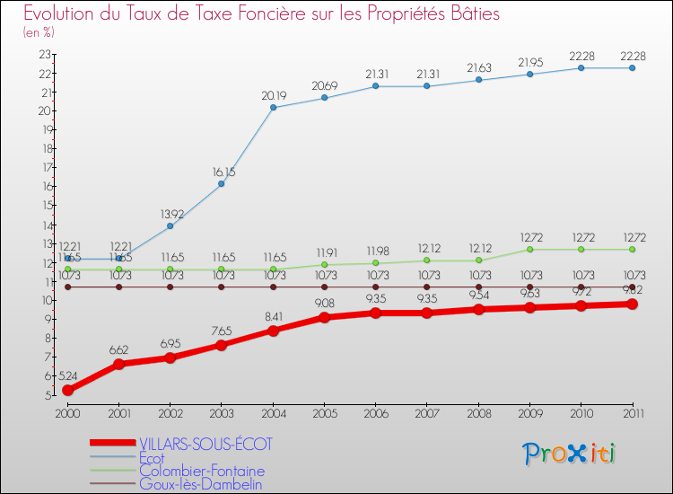 Pendant la même période, les communes françaises similaires à Villars-sous-Écot, ont vu leur taux de taxe foncière sur le bâti augmenter de 13.73 % en moyenne entre 2000 et 2011.