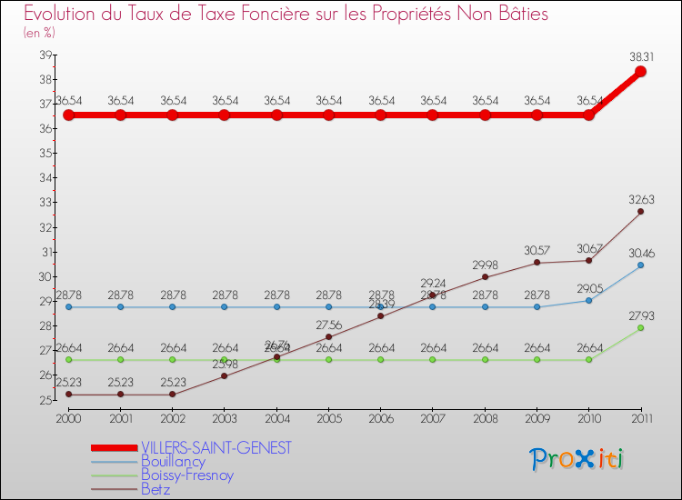 A Villers-Saint-Genest, le taux de taxe foncière sur le non bâti a donc augmenté de 4.84 % entre 2000 et 2011.