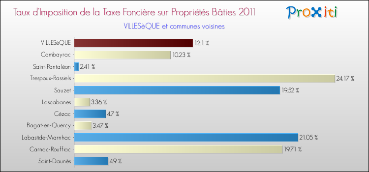 En 2011, le taux de la taxe foncière sur le bâti vôté par le conseil municipal de Villesèque était de : 12.1 %.