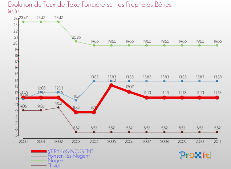 A Vitry-lès-Nogent, le taux de taxe foncière sur le bâti a donc baissé de 0.18 % entre 2000 et 2011.