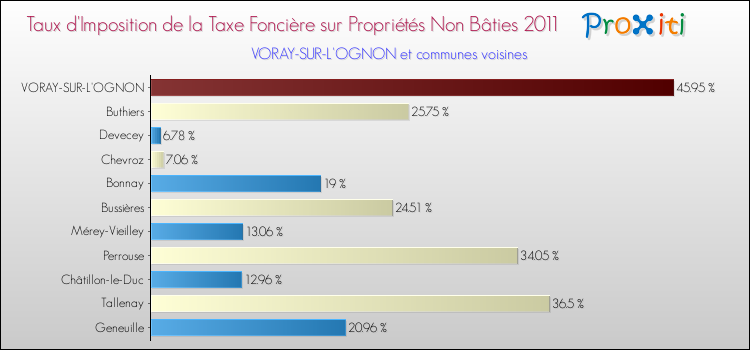 En 2011, le taux de la taxe foncière sur le non bâti vôté par le conseil municipal de Voray-sur-l'Ognon était de : 45.95 %.