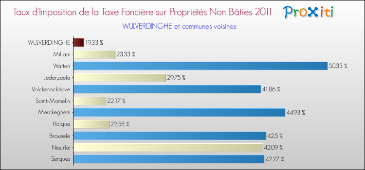 En 2011, le taux de la taxe foncière sur le non bâti vôté par le conseil municipal de Wulverdinghe était de : 19.33 %.