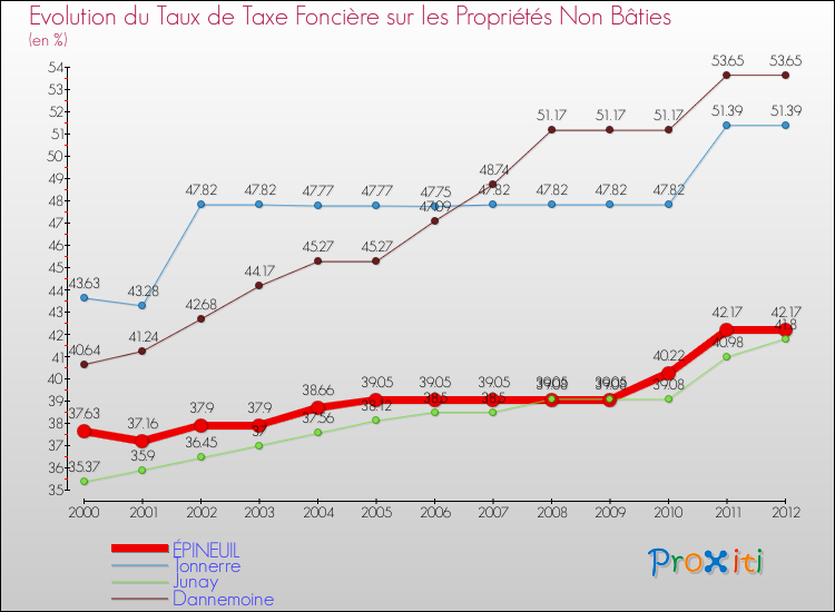 Pendant la même période, les communes françaises similaires à Épineuil, ont vu leur taux de taxe foncière sur le non bâti baisser de 9.98 % en moyenne entre 2000 et 2012.