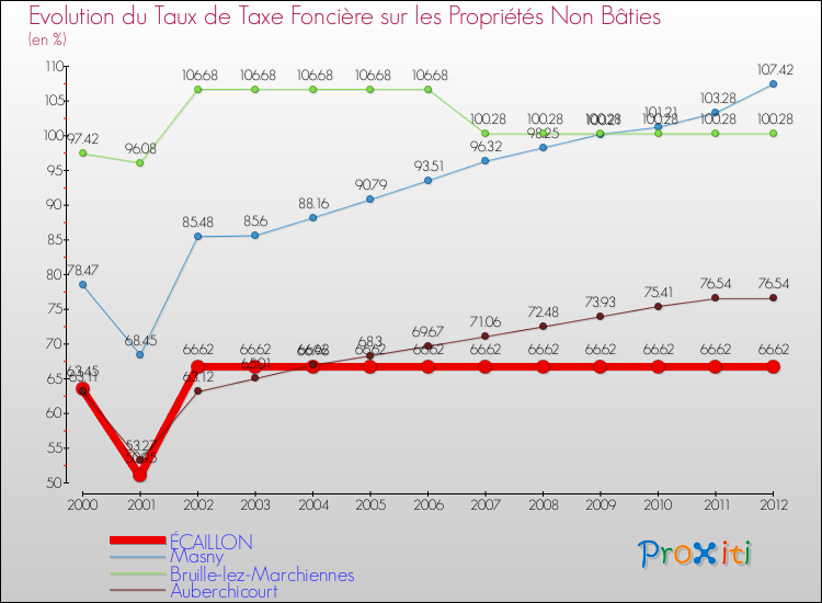 Pendant la même période, les communes françaises similaires à Écaillon, ont vu leur taux de taxe foncière sur le non bâti augmenter de 11.09 % en moyenne entre 2000 et 2012.