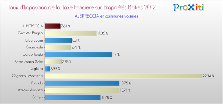 En 2012, le taux de la taxe foncière sur le bâti vôté par le conseil municipal de Albitreccia était de : 7.61 %.