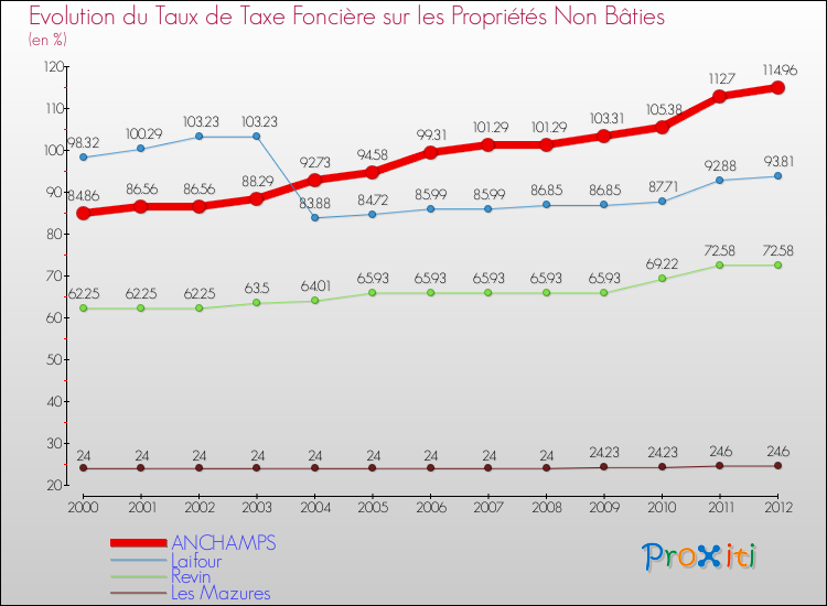 En 2012, le taux de la taxe foncière sur le non bâti vôté par le conseil municipal de Anchamps était de : 114.96 %.