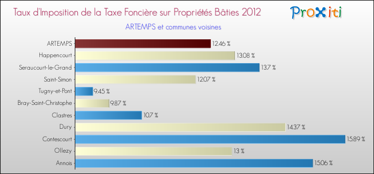 En 2012, le taux de la taxe foncière sur le bâti vôté par le conseil municipal de Artemps était de : 12.46 %.