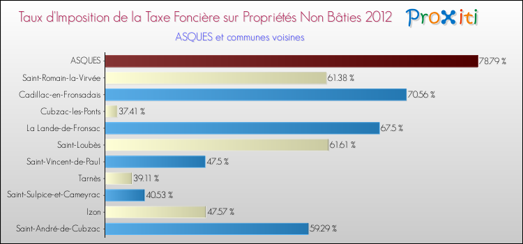 En 2012, le taux de la taxe foncière sur le non bâti vôté par le conseil municipal de Asques était de : 78.79 %.
