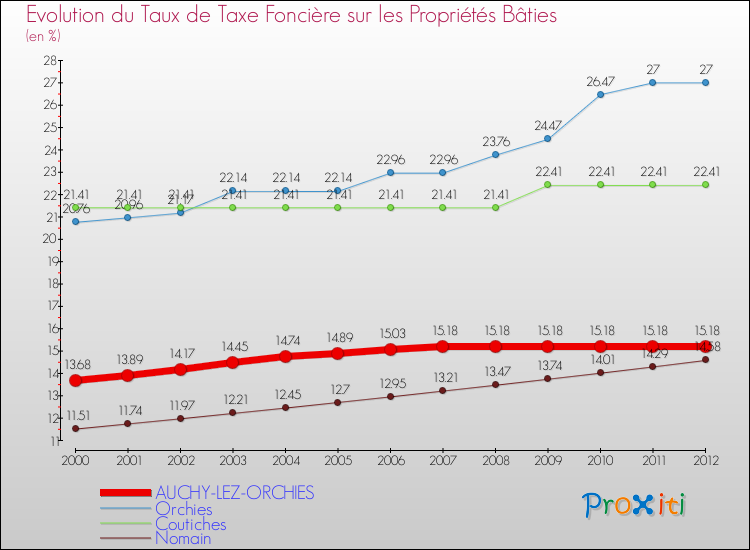 A Auchy-lez-Orchies, le taux de taxe foncière sur le bâti a donc augmenté de 10.96 % entre 2000 et 2012.