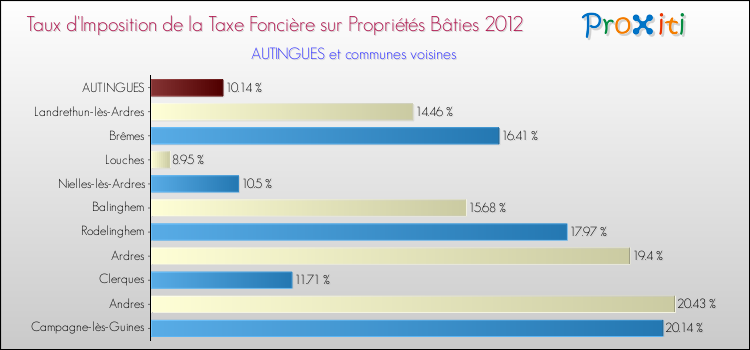 En 2012, le taux de la taxe foncière sur le bâti vôté par le conseil municipal de Autingues était de : 10.14 %.