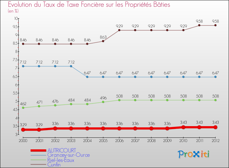 A Autricourt, le taux de taxe foncière sur le bâti a donc augmenté de 4.26 % entre 2000 et 2012.