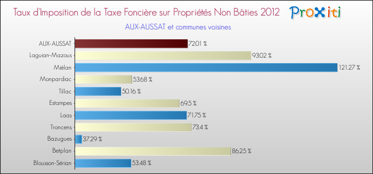 En 2012, le taux de la taxe foncière sur le non bâti vôté par le conseil municipal de Aux-Aussat était de : 72.01 %.