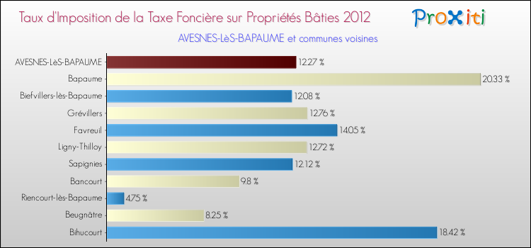 En 2012, le taux de la taxe foncière sur le bâti vôté par le conseil municipal de Avesnes-lès-Bapaume était de : 12.27 %.