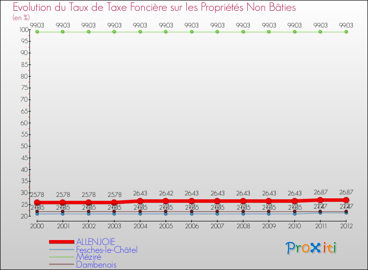 En 2012, le taux de la taxe foncière sur le non bâti vôté par le conseil municipal de Allenjoie était de : 26.87 %.