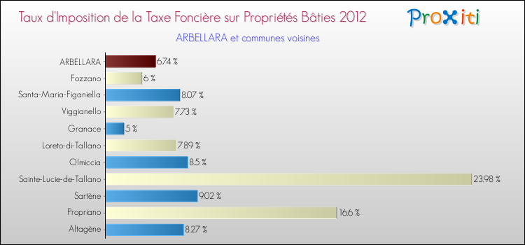 En 2012, le taux de la taxe foncière sur le bâti vôté par le conseil municipal de Arbellara était de : 6.74 %.