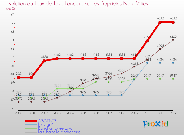 Pendant la même période, les communes françaises similaires à Argentré, ont vu leur taux de taxe foncière sur le non bâti augmenter de 21.78 % en moyenne entre 2000 et 2012.