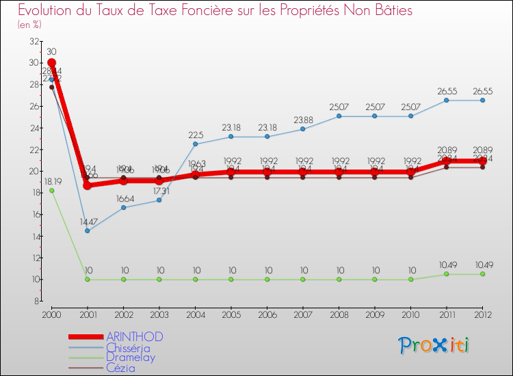 A Arinthod, le taux de taxe foncière sur le non bâti a donc baissé de 30.37 % entre 2000 et 2012.