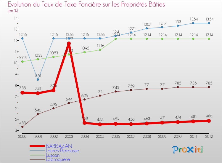 En 2012, le taux de la taxe foncière sur le bâti vôté par le conseil municipal de Barbazan était de : 4.86 %.