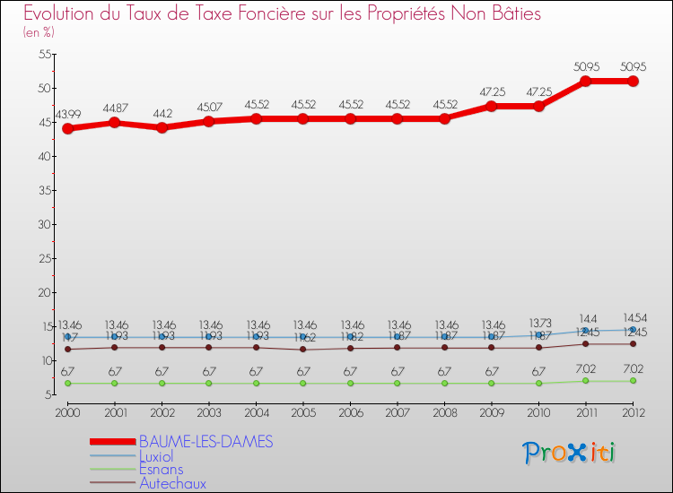 Pendant la même période, les communes françaises similaires à Baume-les-Dames, ont vu leur taux de taxe foncière sur le non bâti augmenter de 0.44 % en moyenne entre 2000 et 2012.