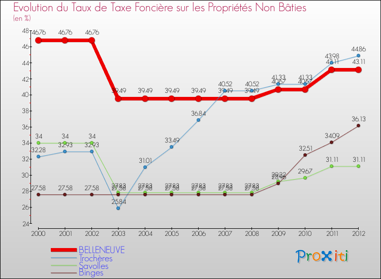 Pendant la même période, les communes françaises similaires à Belleneuve, ont vu leur taux de taxe foncière sur le non bâti baisser de 9.98 % en moyenne entre 2000 et 2012.