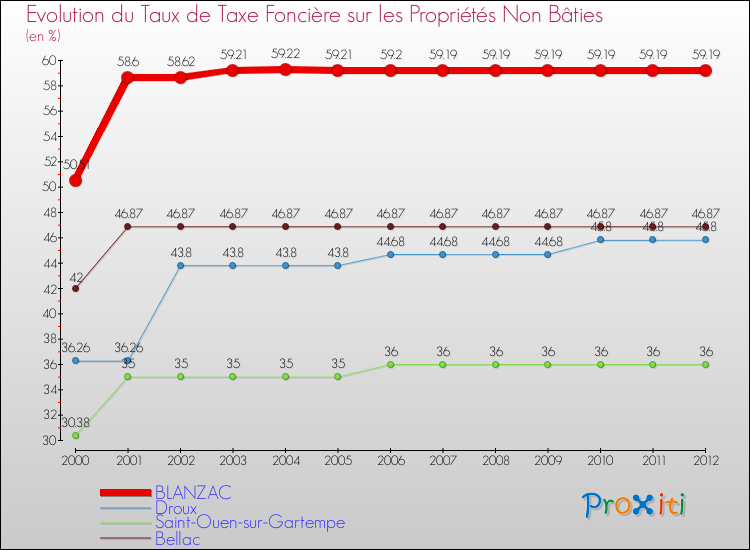 En 2012, le taux de la taxe foncière sur le non bâti vôté par le conseil municipal de Blanzac était de : 59.19 %.