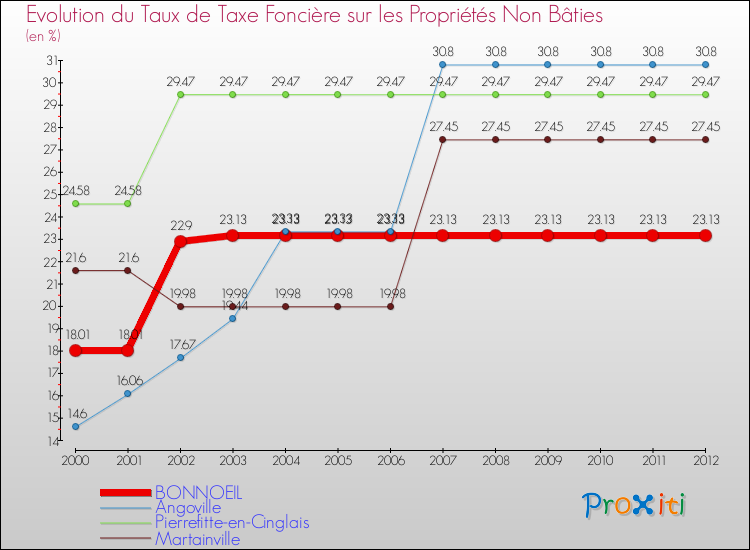 A Bonnoeil, le taux de taxe foncière sur le non bâti a donc augmenté de 28.43 % entre 2000 et 2012.