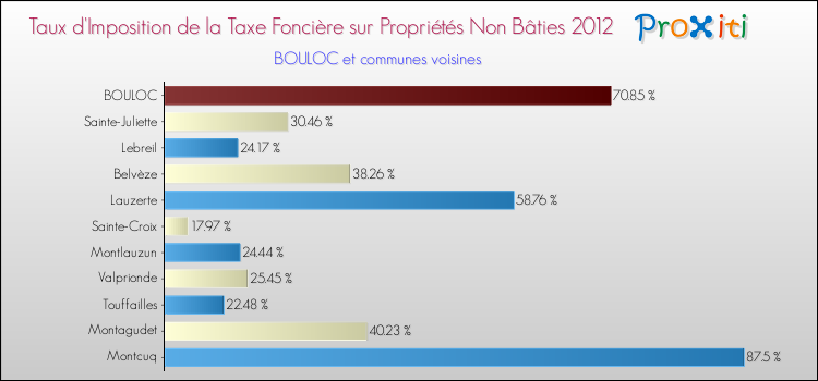 En 2012, le taux de la taxe foncière sur le non bâti vôté par le conseil municipal de Bouloc était de : 70.85 %.